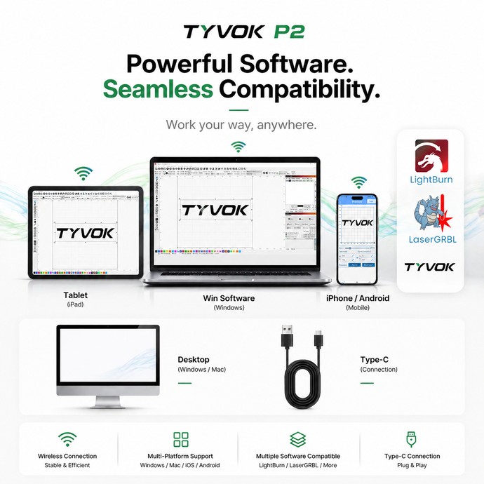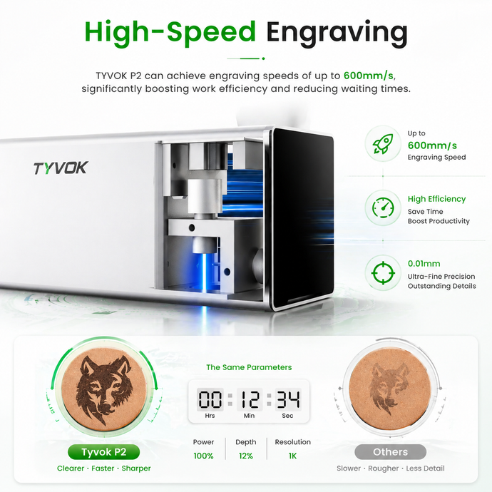 The Tyvok P2 delivers an excellent balance of speed, precision, and flexibility. Combined with powerful laser performance and broad software compatibility, it is suitable for a wide range of applications — from creative hobbies to professional engraving.