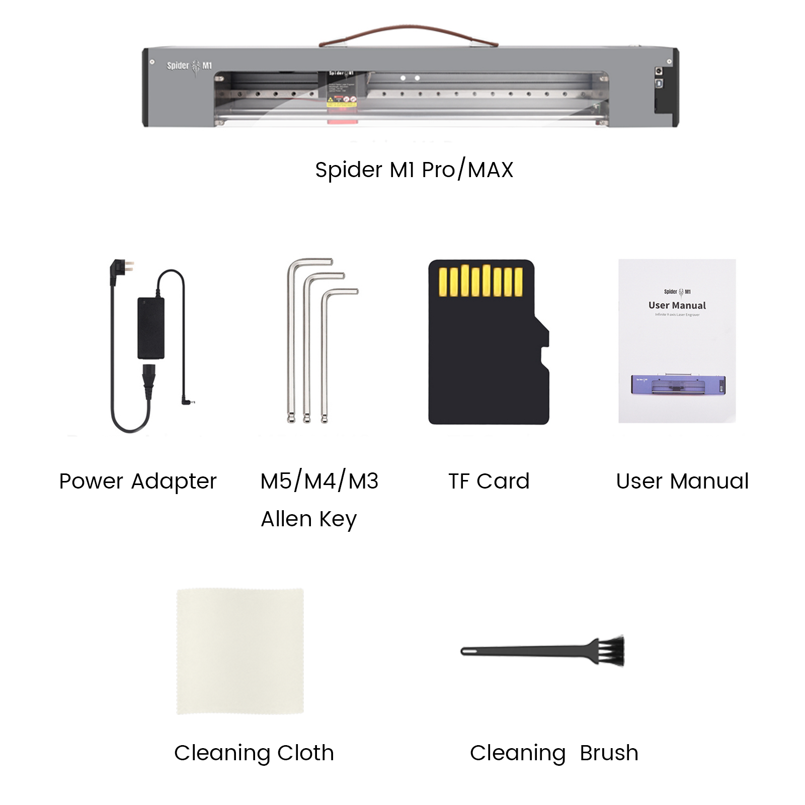 Spider M1 には、Standard、Pro、Max の 3 つのバージョンがあります。作業領域は、Standard/Pro バージョンが 200 mm* ∞、Max バージョンが 400 mm* ∞ です。電力は、Standard バージョンが 5W、Pro/Max バージョンが 10W です。